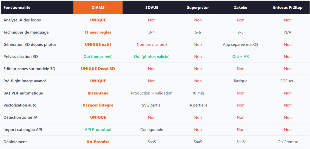 Zakeke nécessite une app macOS séparée. 3DVUE fait appel à un service pro. Superpictor n’a pas de 3D. DIAMS est la seule plateforme tout-en-un.